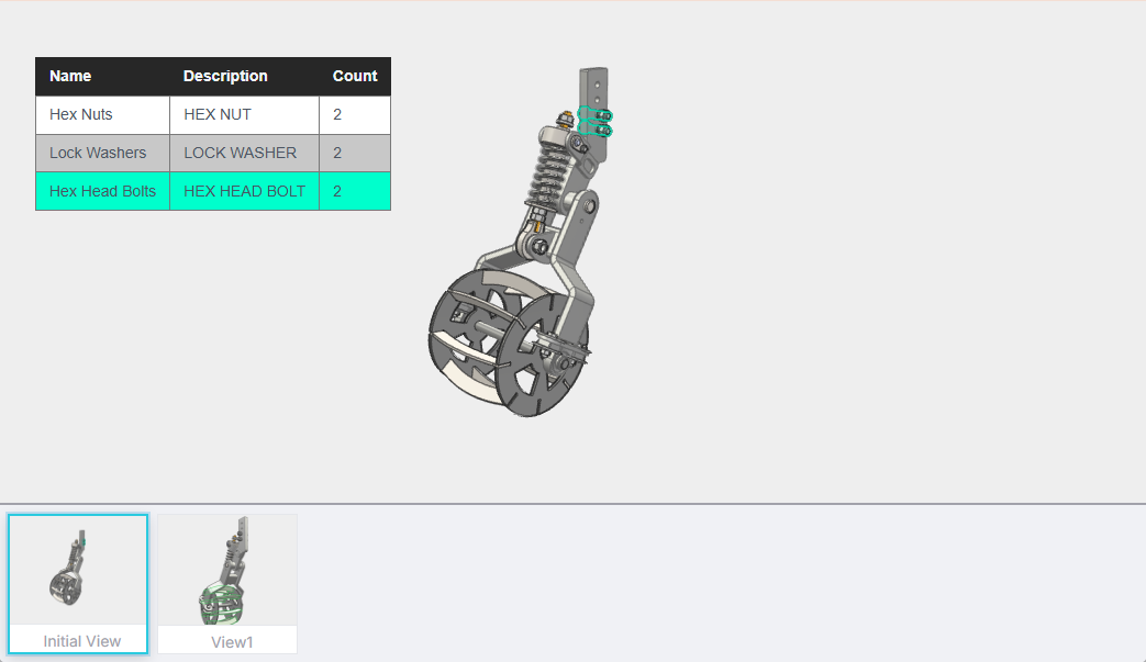 • Clicking a row in the BOM highlights the part in the 3D model